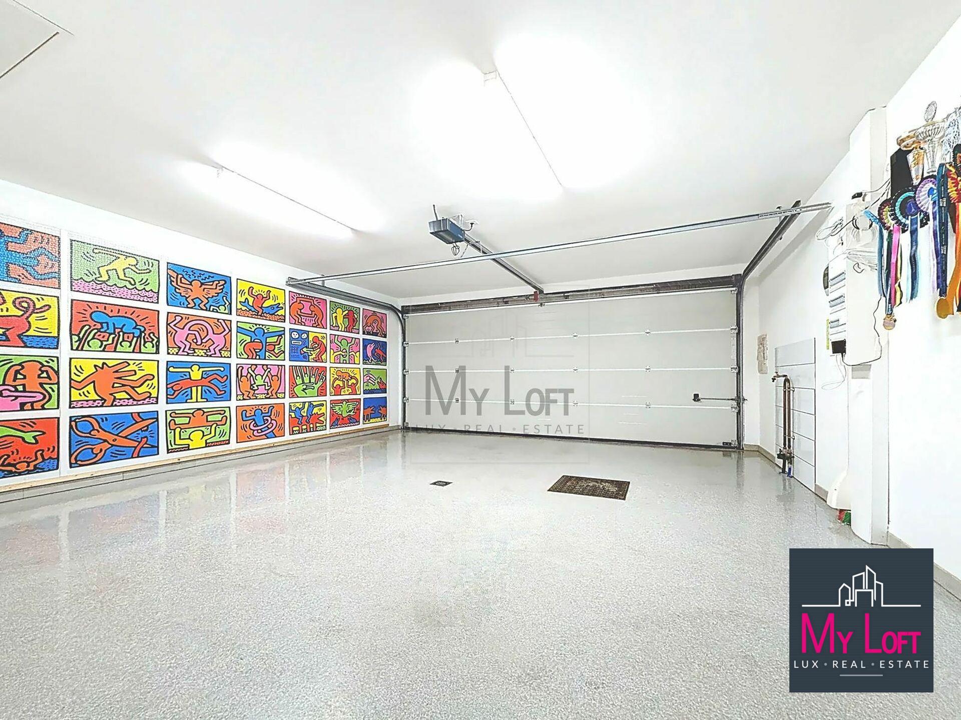 - Garage double avec portes sectionnelles motorisées, grand espace de rangement au dessus du garage