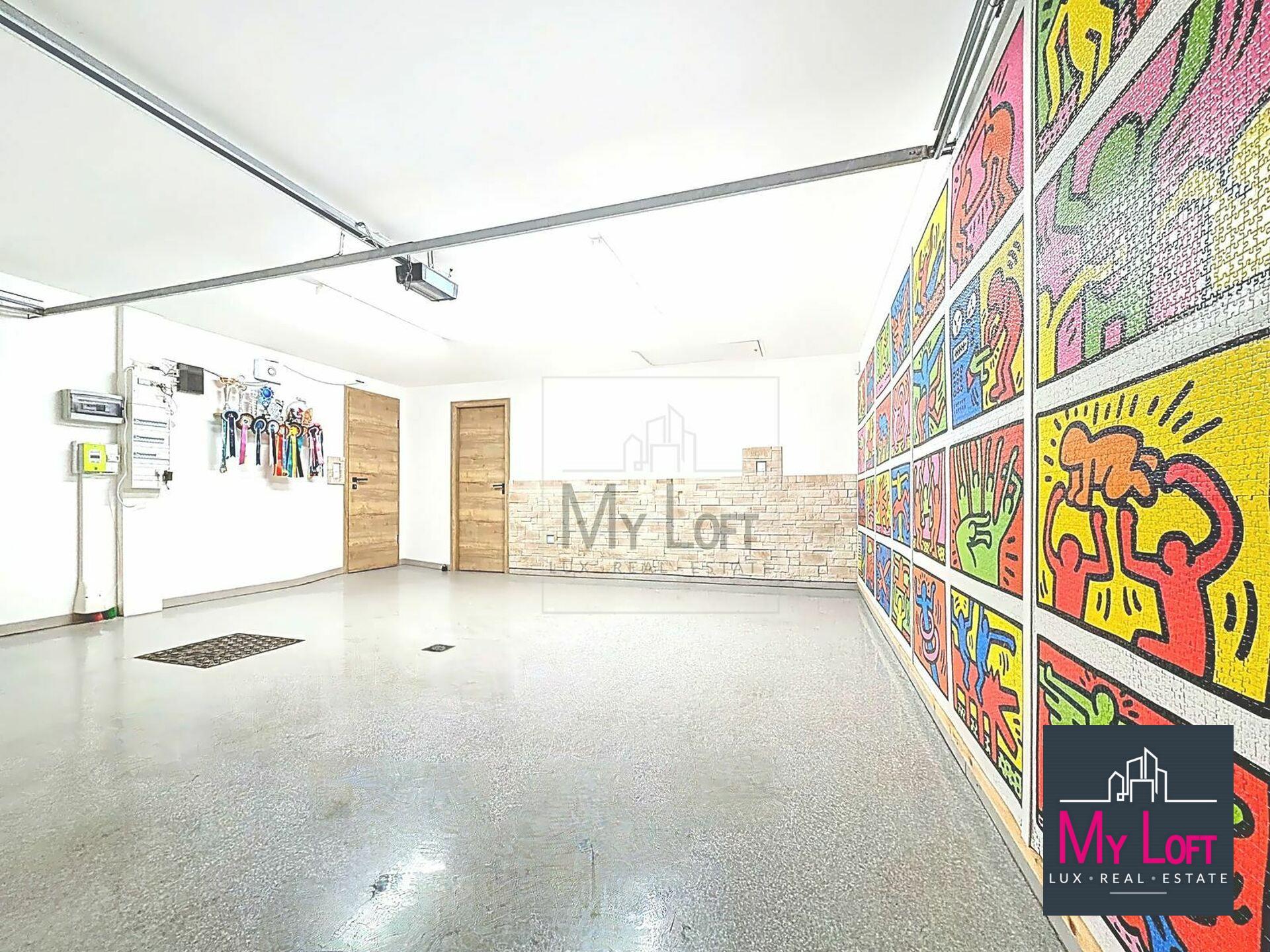 - Garage double ±32 m², belle hauteur sous plafond, espace de stockage en mezzanine