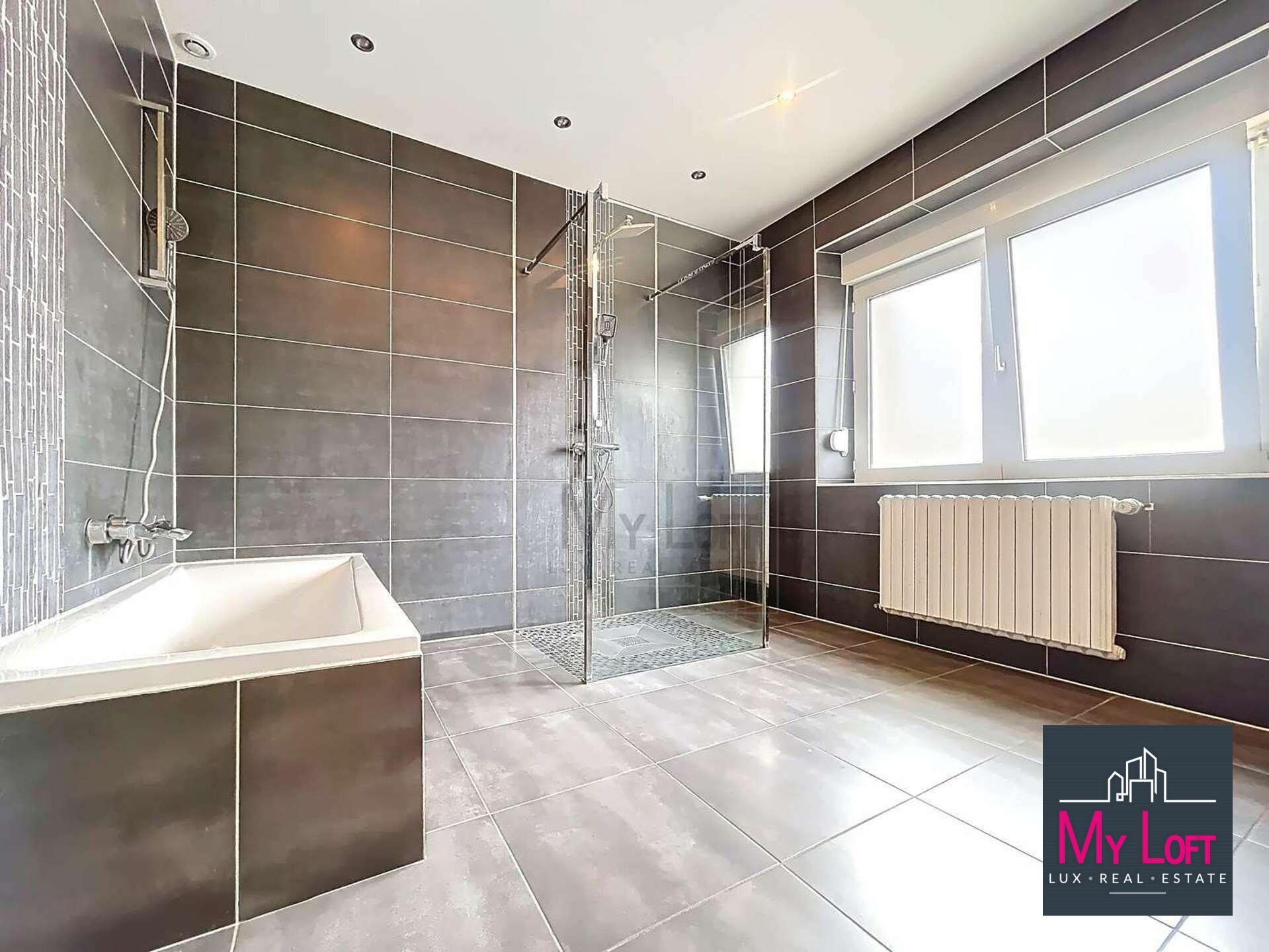 - Salle de bain entièrement carrelée, équipée d'une faïence murale, comprenant une douche, une baignoire, un meuble double vasque et WC (+/- 10,69 m²)