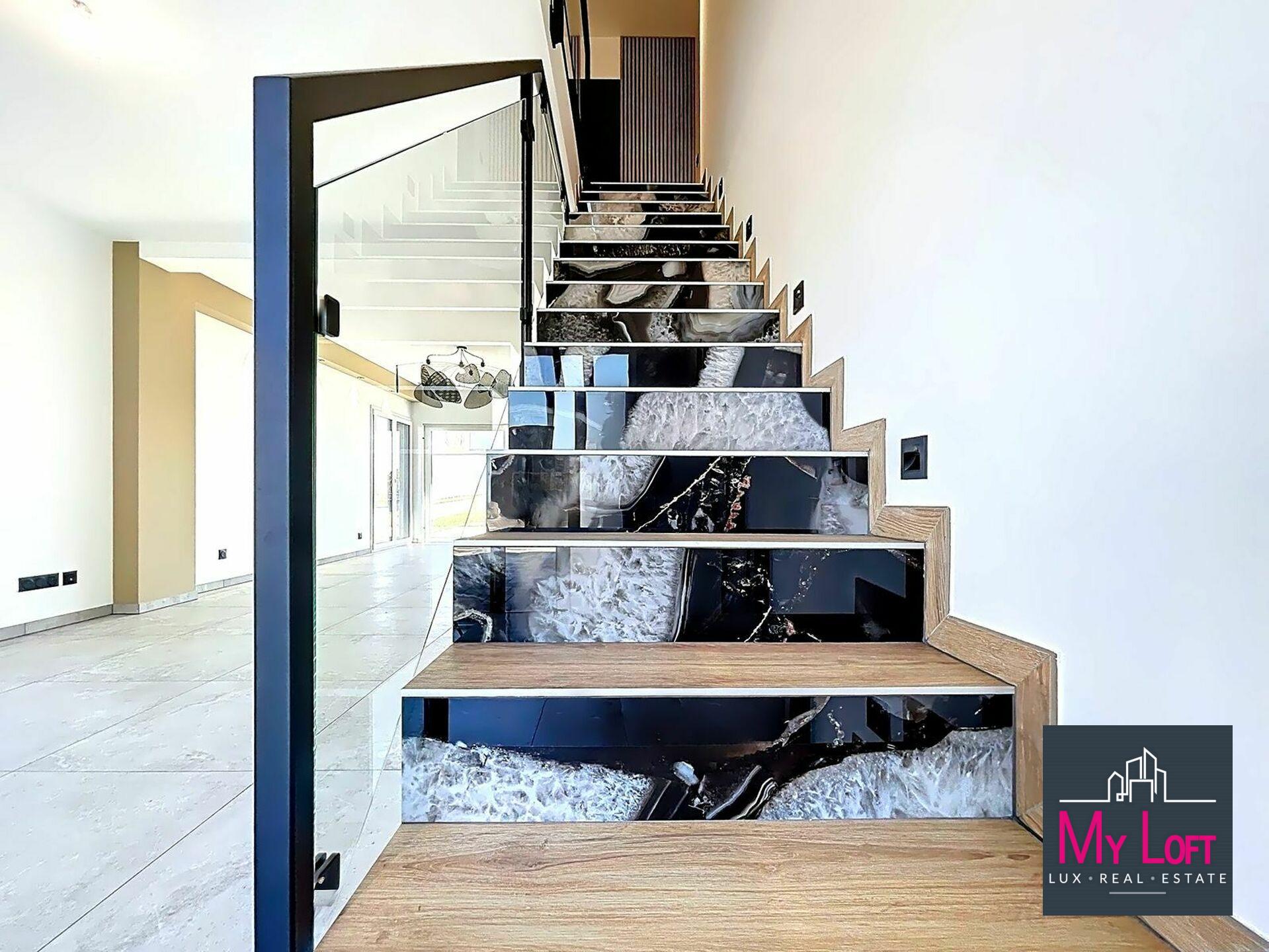 - Vaste pièce à vivre de+/ -52 m2 sublimée par un carrelage effet pierre et ouvert sur une terrasse élégante et un jardin piscinable. - Garde-corps en verre pour une touche design et aérienne, laissant entrer la transparence et la modernité. - 4 chambres raffinées avec parquet semi-massif, offrant chaleur et intimité. - 2 salles de bain signées Hans Grohe, Duravit et Philippe Starck, aux lignes contemporaines et aux matériaux haut de gamme.